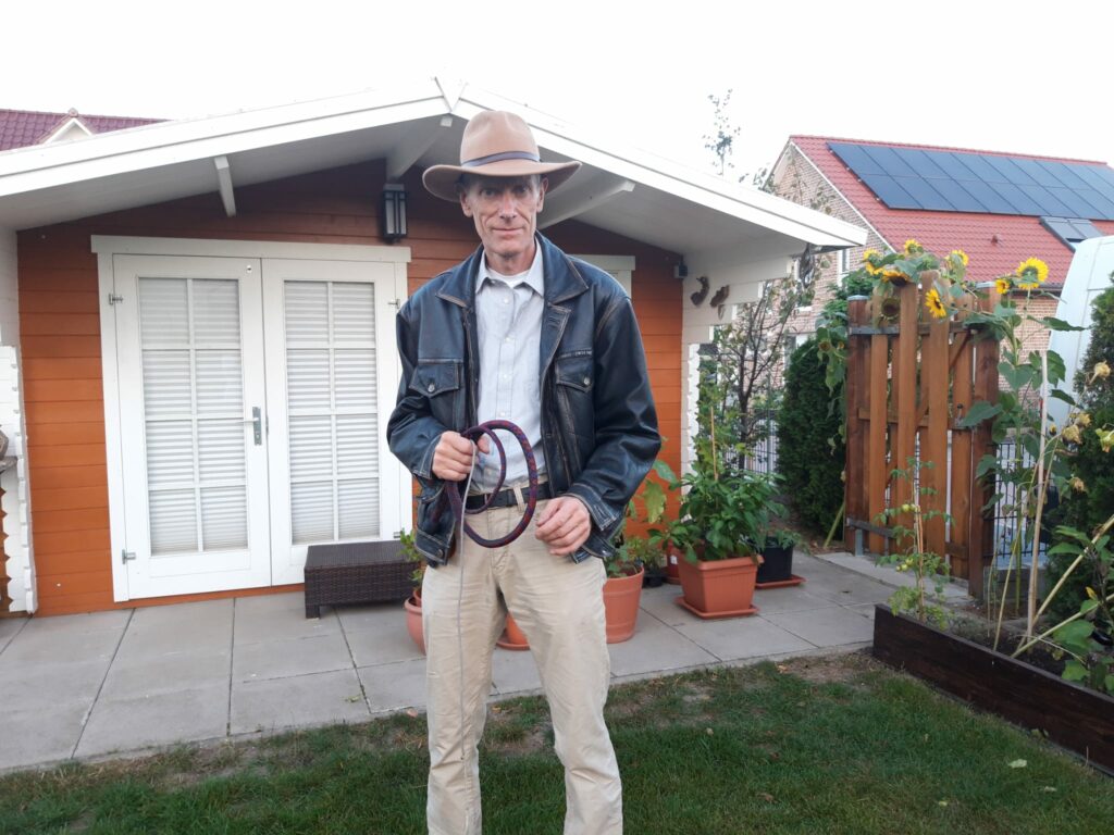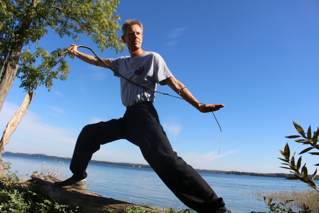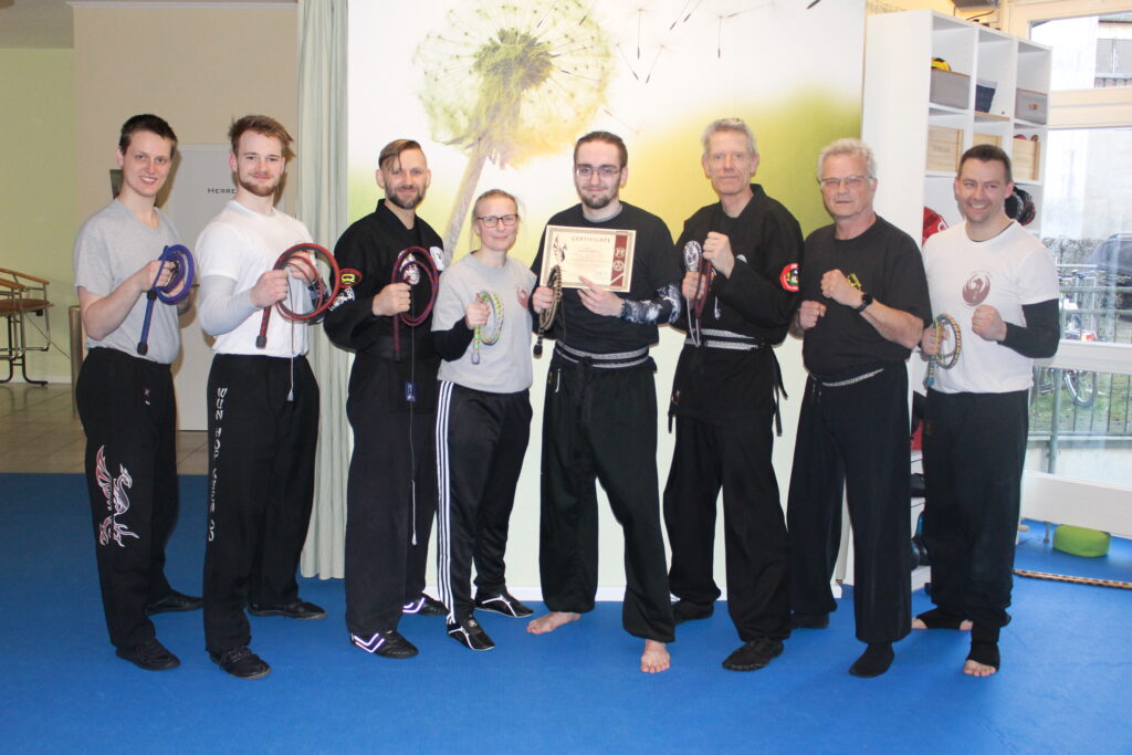 In der Schweriner KungFu Schule wurde die Ausbildung mit der Peitsche zu einer festen Unterrichtsstunde und es gibt bis heute mindestens alle drei Monate ein Seminar. In der Zeit der Kontaktsperren unterrichtete ich weiter über den Bildschirm bis Nordrhein-Westfalen. Dank der ständig aktualisierten Internetseite fanden und finden immer wieder neue Interessenten zu uns. Selbst aus Bayern waren sieben Stunden nicht zu weit, um an unseren Seminaren teilzunehmen. Innerhalb von drei Jahren schrieb ich nebenbei auch gemeinsam mit meiner Familie das Buch über GM Ron. Während wir am Anfang die Peitschen in den USA kauften, fanden sich mit der Zeit unter uns fähige und begabte Peitschenbauer, die bis heute unseren Bedarf für Kinder und Erwachsene decken. Auch eigens für uns gestaltete Hosen und Jacken prägten zunehmend unser unverwechselbares Erscheinungsbild.